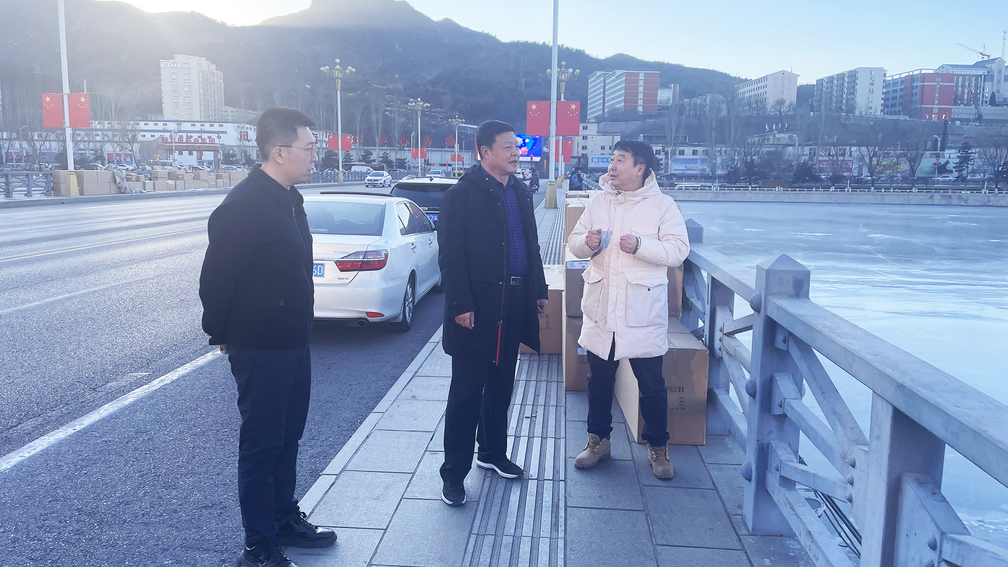 在府前路大桥施工现场,徐俊儒总经理听取了施工单位关于亮化工程的施工进展及疫情防控情况介绍,了解了设备安装和材料采购运输情况,查看了工程施工进展及相关安全防护措施。